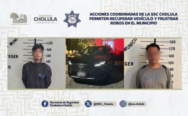 Como parte de las estrategias de seguridad implementadas por el Gobierno Municipal de San Pedro Cholula, elementos de la Secretaría de Seguridad Ciudadana (SSC Cholula) lograron la recuperación de un vehículo con reporte de robo y detuvieron a dos personas por su probable participación en hechos delictivos distintos.