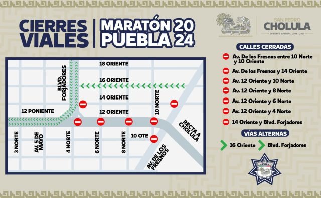 A través de la Dirección de Vialidad Municipal de la Secretaría de Seguridad Ciudadana (SSC Cholula), se implementarán dispositivos a partir de las 05:00 horas; por lo tanto, se mantendrán cerradas las siguientes vialidades:
