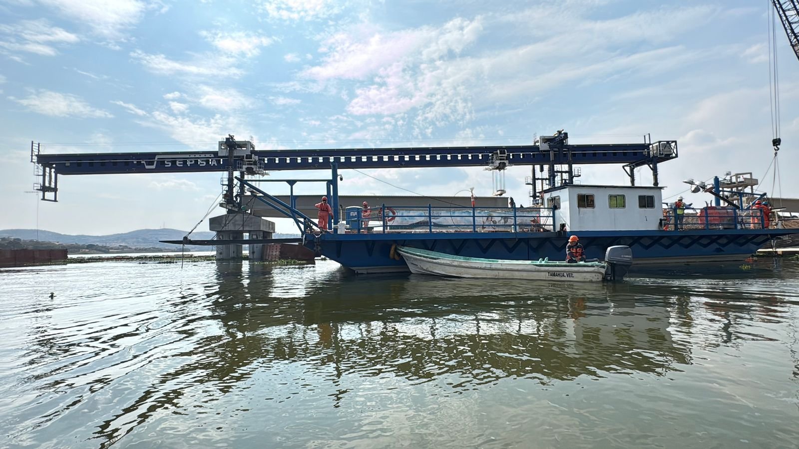 Con trabajos diurnos y nocturnos se colocaron trabes que conformarán la estructura de esta nueva vía de comunicación y que conectarán a San Baltazar Tetela y los Ángeles Tetela. La complejidad es relevante, ya que se realizan acciones en tierra y en el espejo de agua, aunado a que cada trabe tiene un peso superior a las 65 toneladas. Cabe destacar que por primera vez en la entidad se empleó la Máquina Lanzadora de Trabes, equipo que permite colocar los elementos de manera segura, eficiente y rápida.