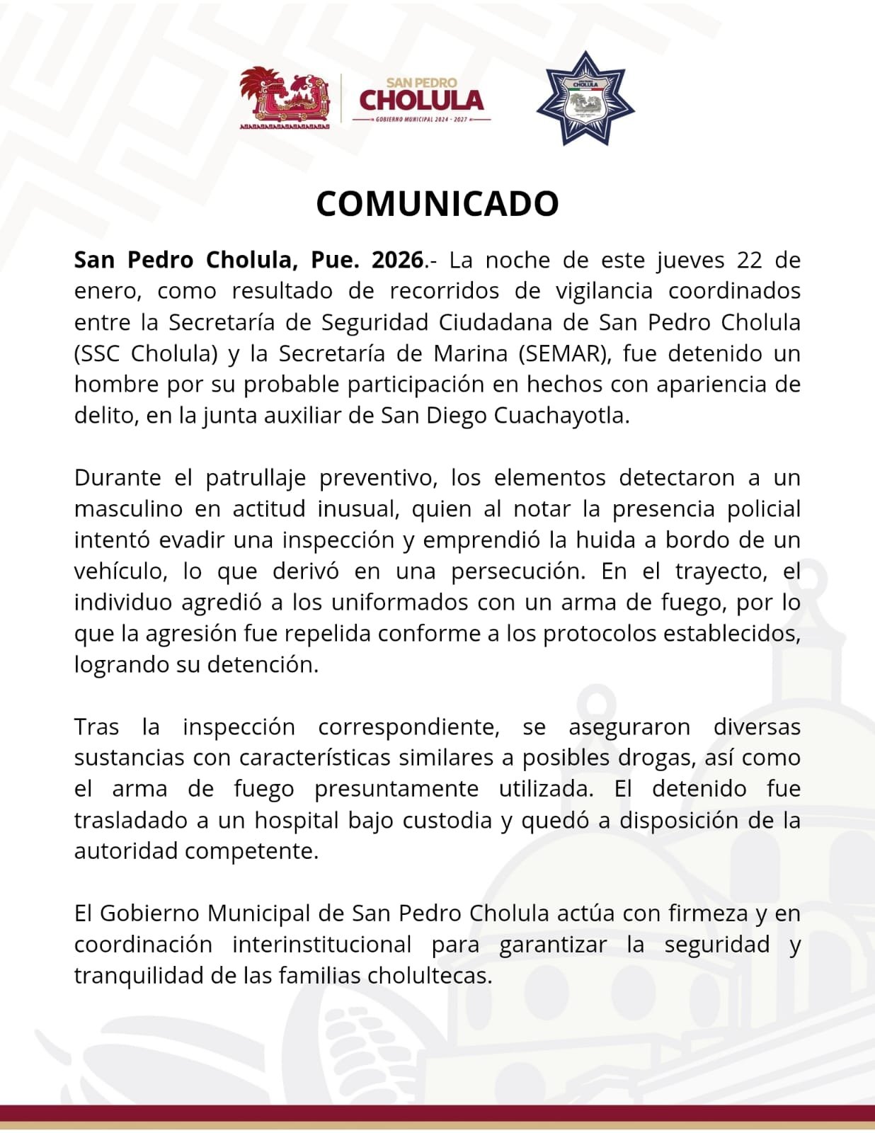 La noche de este jueves 22 de enero, como resultado de recorridos de vigilancia coordinados entre la Secretaría de Seguridad Ciudadana de San Pedro Cholula (SSC Cholula) y la Secretaría de Marina (SEMAR), fue detenido un hombre por su probable participación en hechos con apariencia de delito, en la junta auxiliar de San Diego Cuachayotla.