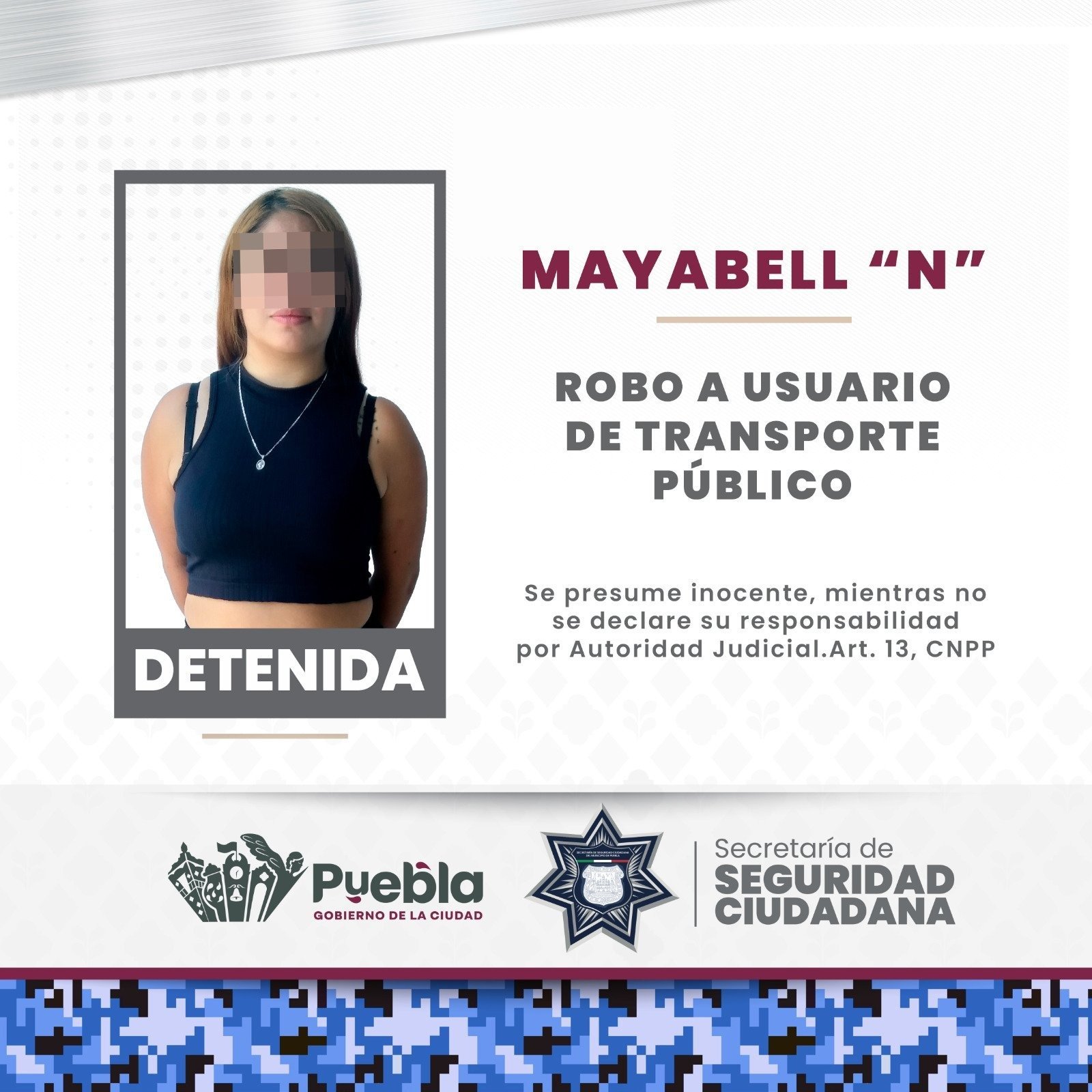Elementos de la Policía Municipal de Puebla detuvieron a una mujer identificada como Mayabell “N”, señalada por su presunta participación en un robo cometido contra un usuario del transporte público.