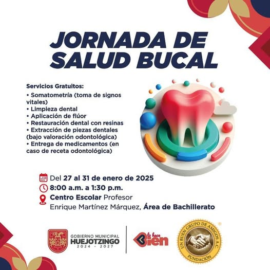 El Gobierno Municipal de Huejotzingo anunció una Jornada de Salud Bucal gratuita que se llevará a cabo del 27 al 31 de enero.