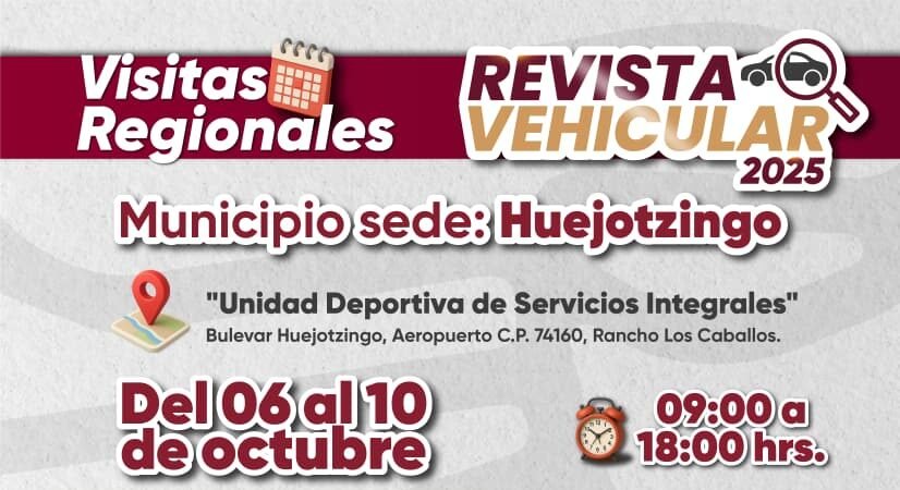 La Secretaría de Movilidad y Transporte de Puebla implementará el programa de Revista Vehicular 2025 en el municipio de Huejotzingo. El servicio estará disponible del 6 al 10 de octubre, en un horario de 9:00 a 18:00 horas, en la Unidad Deportiva de Servicios Integrales, ubicada en Bulevar Huejotzingo, Aeropuerto, Rancho “Los Caballos”.