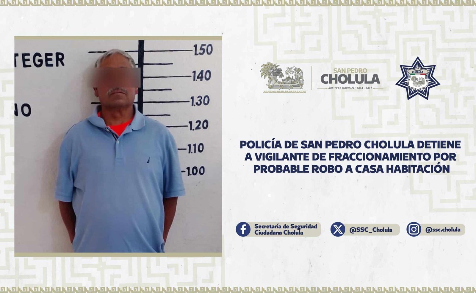 de Seguridad Ciudadana de San Pedro Cholula (SSC Cholula) detuvieron a Julián “N”, de 56 años de edad, por su probable participación en el delito de robo a casa habitación, ocurrido en un inmueble ubicado sobre la carretera estatal a Coronango, al interior del Fraccionamiento San Joaquín, conocido como San Diego Los Sauces.