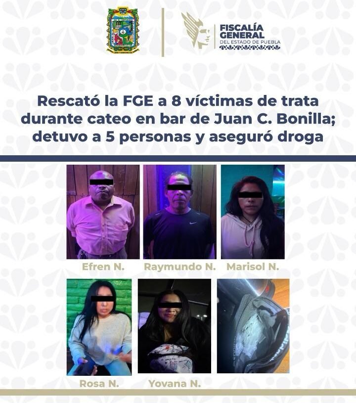 Tras un operativo en el bar «Bum Bum» del municipio de Juan C. Bonilla, la Fiscalía de Puebla rescata a ocho mujeres víctimas de trata de personas y detuvo a cinco personas como responsables del delito.