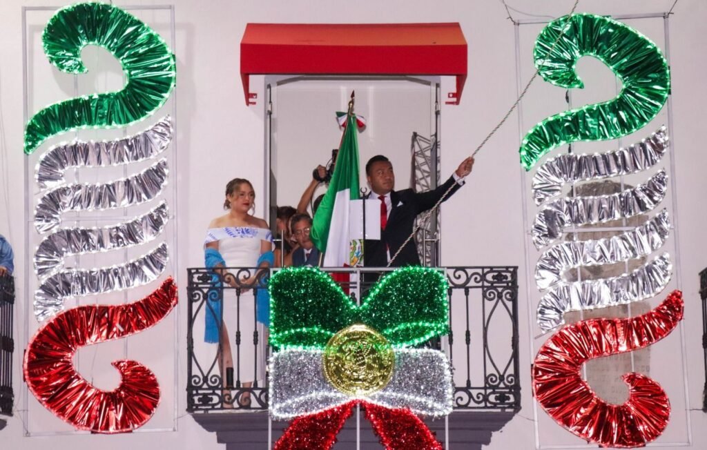 En un ambiente lleno de orgullo y fervor patrio, el Presidente Municipal de Huejotzingo, Roberto Solís Valles, encabezó por primera vez la ceremonia del 215 Aniversario del Grito de Independencia desde el balcón del Palacio Municipal, acompañado de la Presidenta Honoraria del DIF, Shamy Spezia, y sus tres hijos.