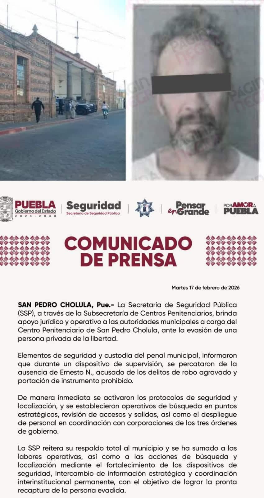La Secretaría de Seguridad Pública (SSP), a través de la Subsecretaría de Centros Penitenciarios, brinda apoyo jurídico y operativo a las autoridades municipales tras la evasión de una persona privada de la libertad del Centro Penitenciario de San Pedro Cholula.
