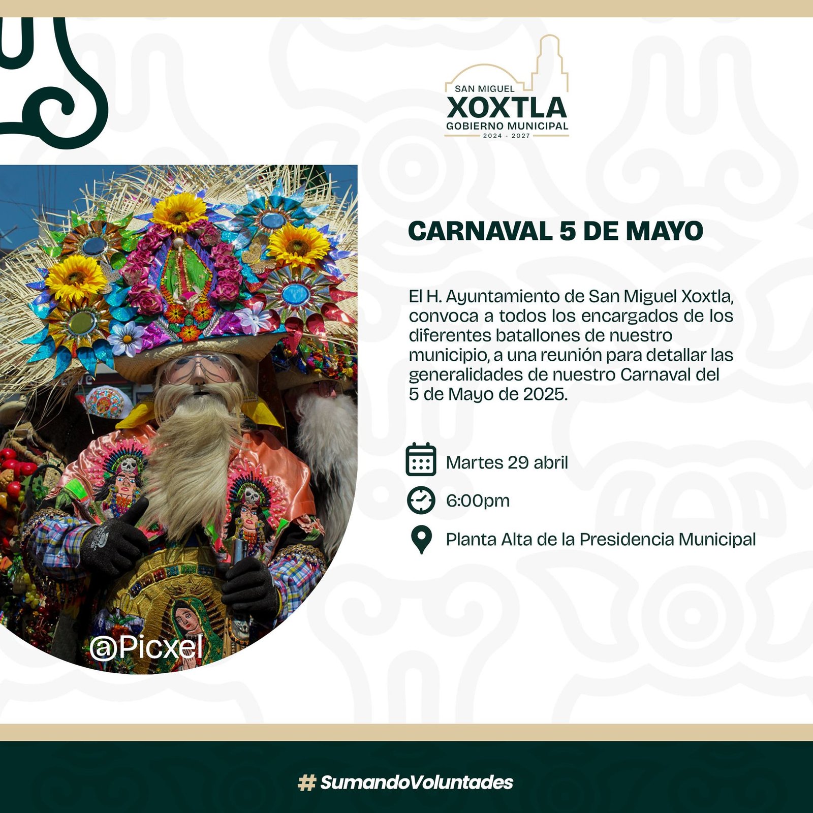 El Ayuntamiento de San Miguel Xoxtla convocó a los encargados de los batallones del municipio a una reunión para coordinar los detalles del Carnaval del 5 de Mayo de 2025.